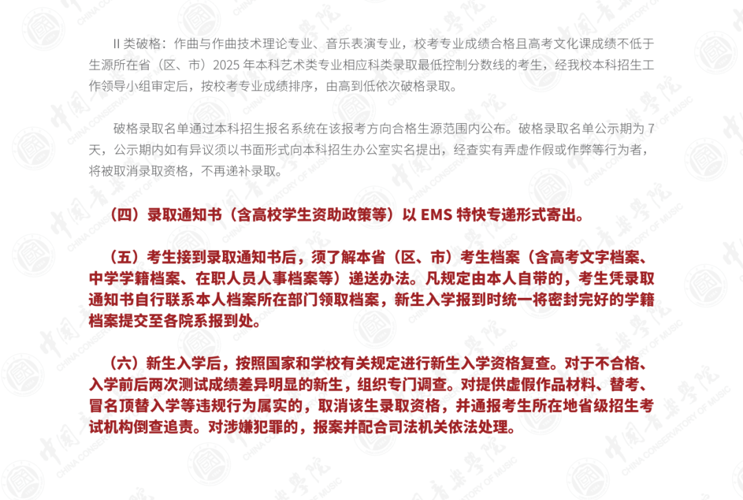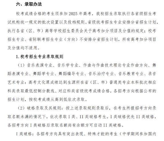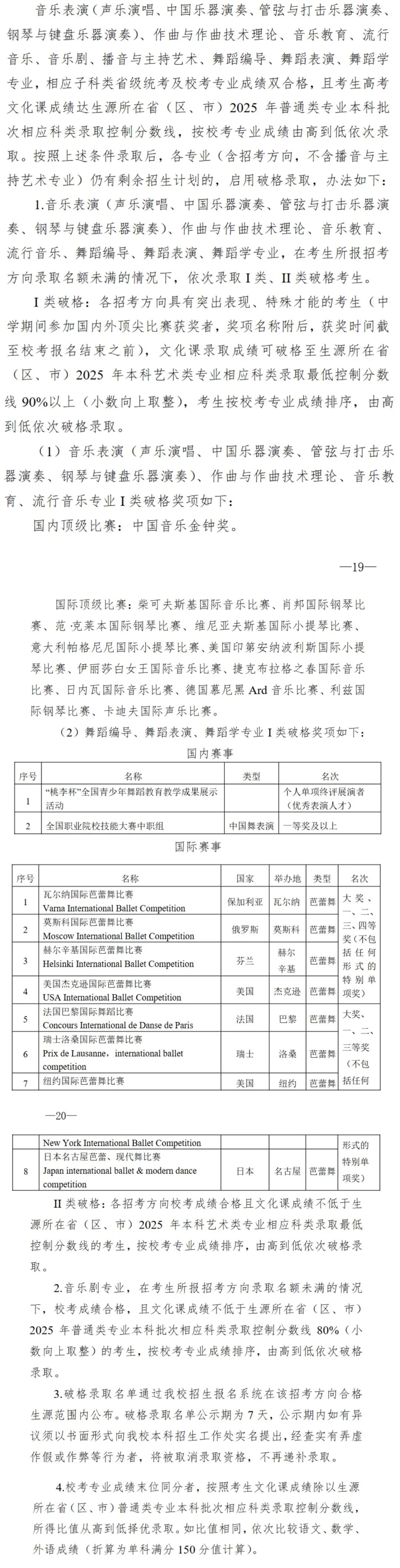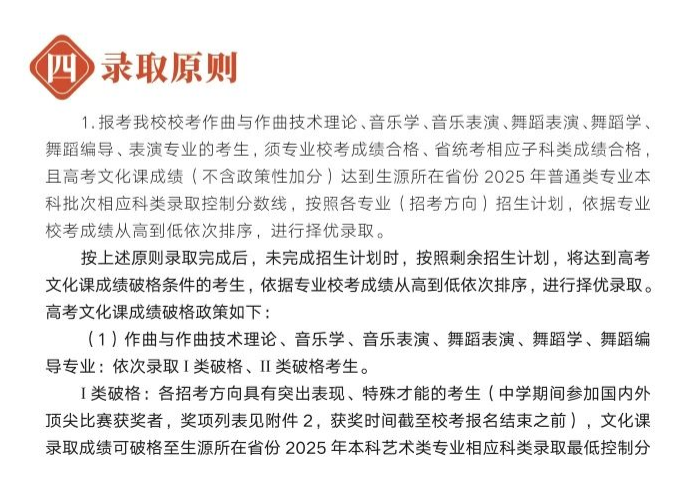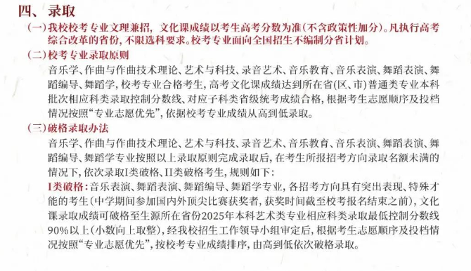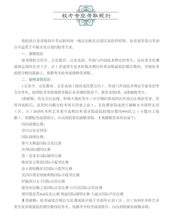 ② 音樂類的破格錄取分為I類和II類,先者需要獲得金鐘獎等賽事獎項,有相應(yīng)的證書,才有資格破格錄取,后者則是按照校考排名,文化分過藝術(shù)類線,從高到低破格錄取,直至招滿。