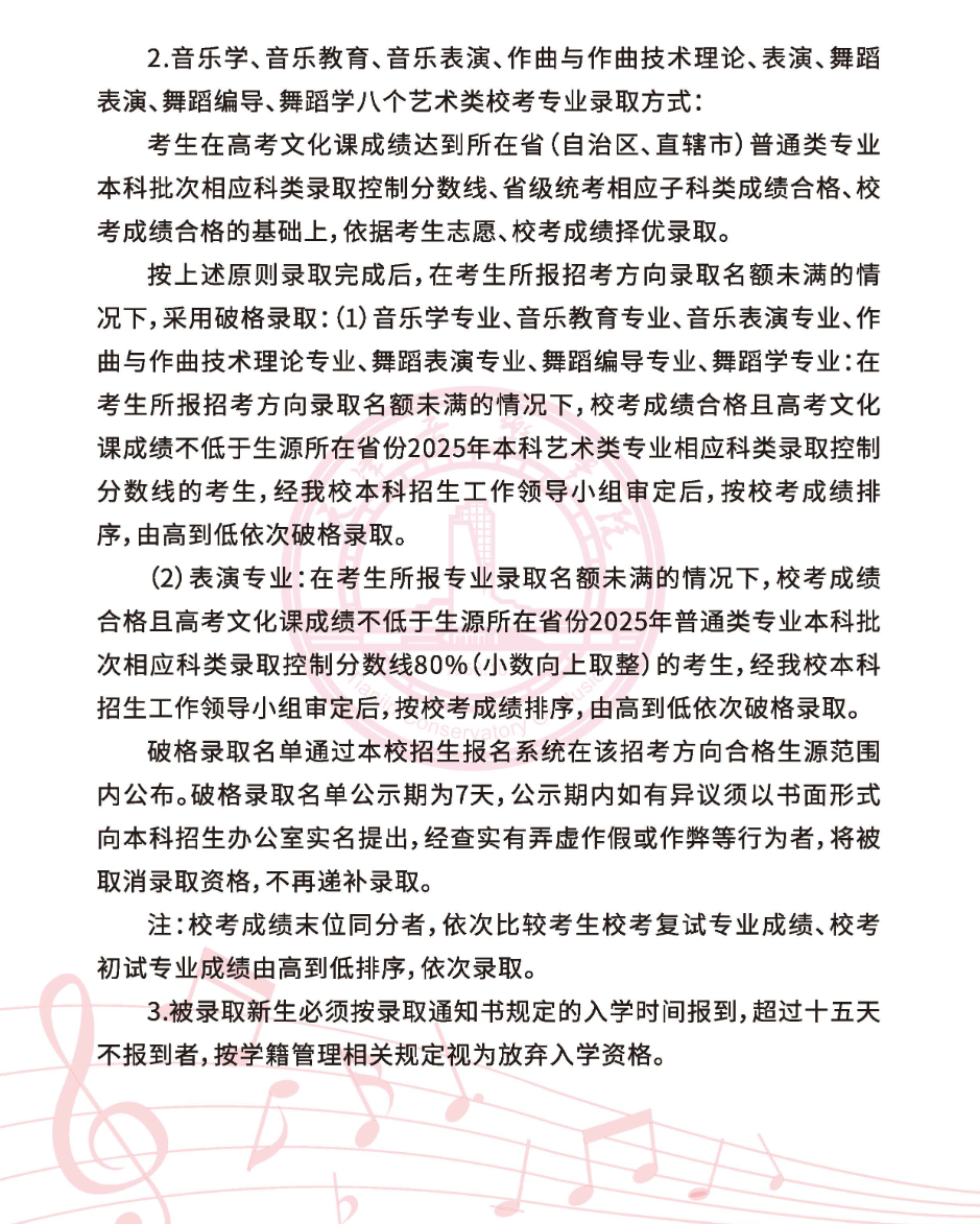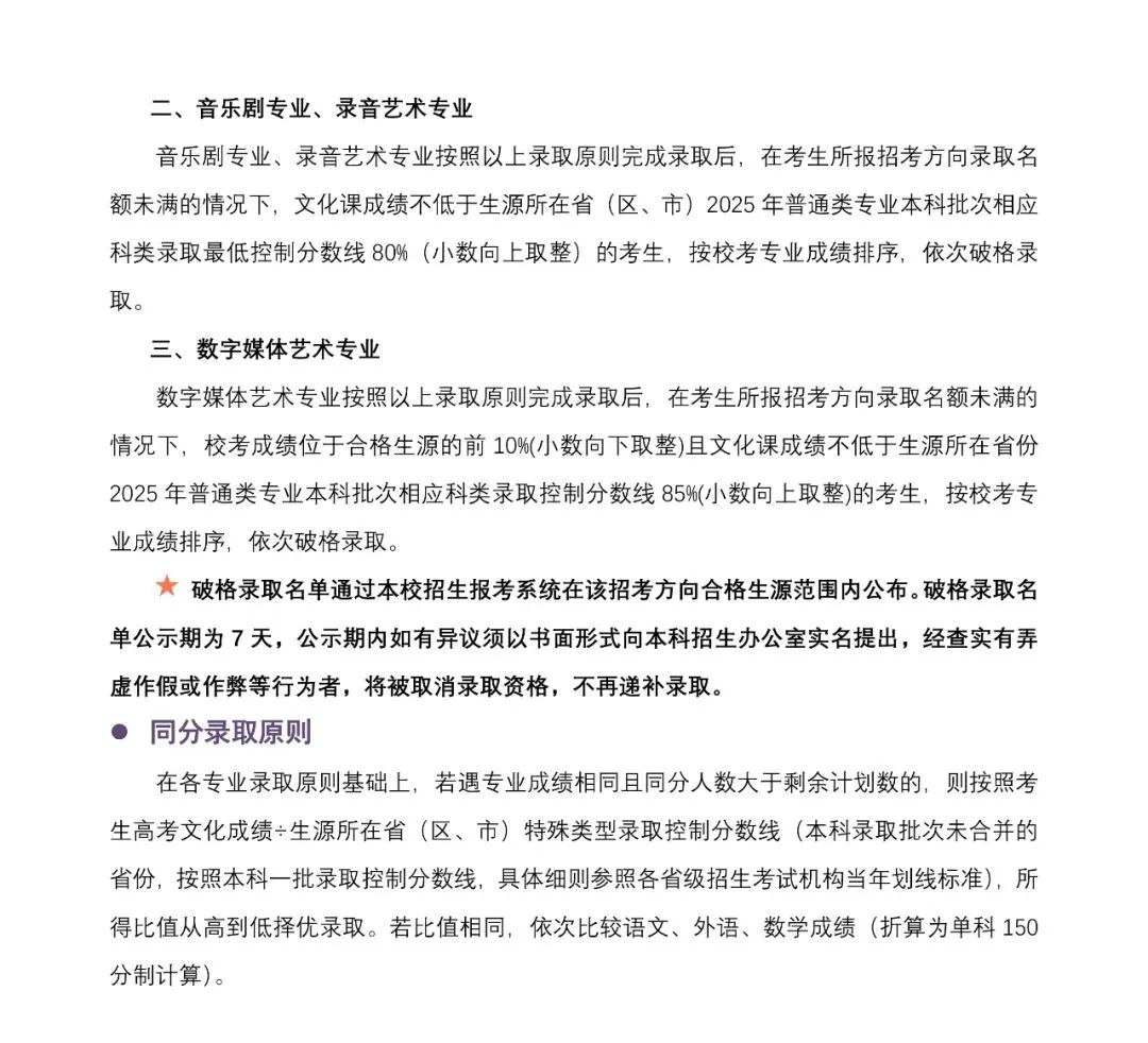 ① 破格錄取,一般情況下是校考院校在錄取名額未滿的情況下,各專業(yè)按照校考成績排名,從報考該類別合格生源(一般為前10%-15%)中進行破格錄取。破格錄取要求考生高考文化課成績不得低于所在省份普本線的相應(yīng)比例(一般為普本線的85%,部分學校要求90%)。