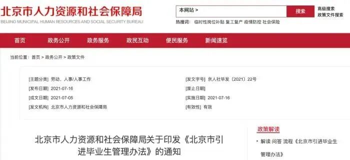 北京市人力資源和社會保障局發(fā)布的《北京市引進畢業(yè)生管理辦法》(來源:北京市人社局官網)為優(yōu)秀畢業(yè)生留京發(fā)展提供了政策保障。