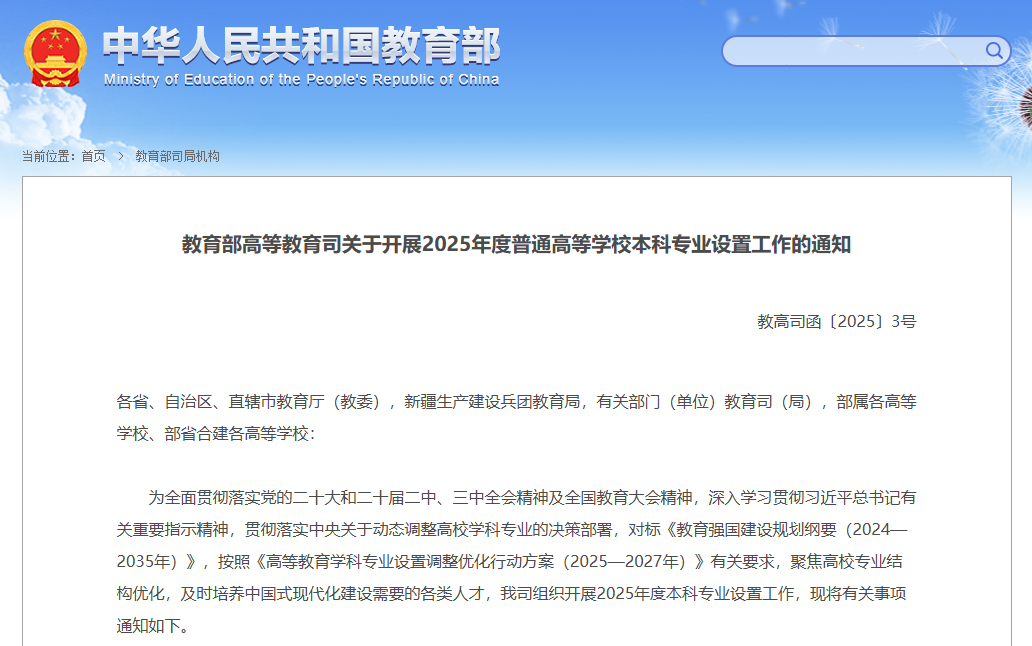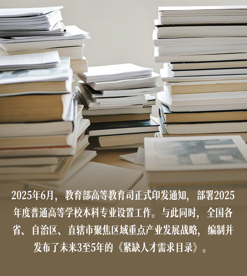2025年6月,教育部高等教育司正式印發(fā)通知,部署2025年度普通高等學校本科專業(yè)設置工作。與此同時,全國各省、自治區(qū)、直轄市聚焦區(qū)域重點產業(yè)發(fā)展戰(zhàn)略,編制并發(fā)布了未來3至5年的《緊缺人才需求目錄》。