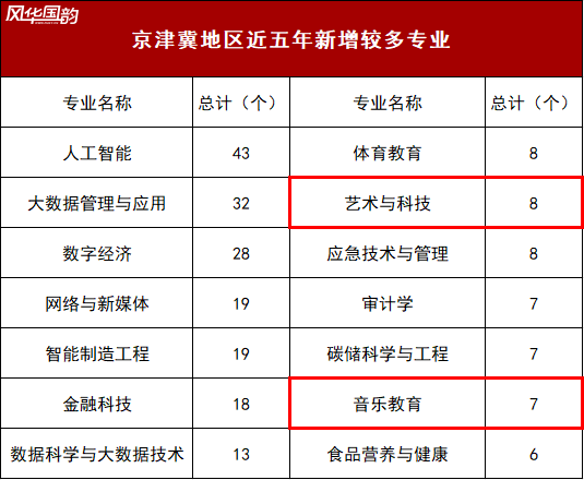 近五年,該區(qū)域在大力增設人工智能、大數(shù)據管理與應用、數(shù)字經濟等前沿領域專業(yè)的同時,音樂類專業(yè)也獲得了顯著增長(總計增設15個以上本科專業(yè))。