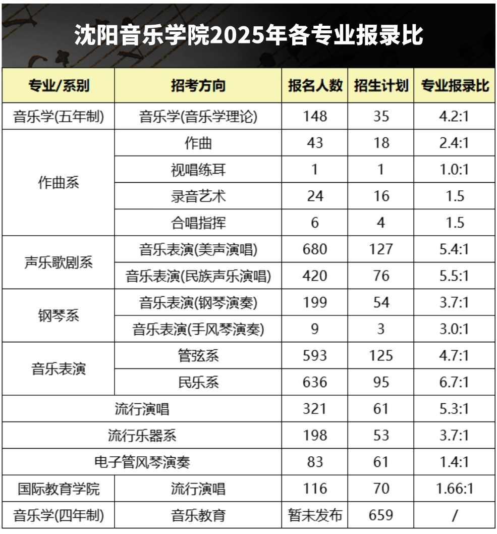 免責(zé)聲明: 《招生人數(shù)最多?沈陽音樂學(xué)院2025年各專業(yè)最新報錄比情況解析!》 文章內(nèi)容來源網(wǎng)絡(luò)整理僅供參考,若有來源標(biāo)注錯誤或侵犯了您的合法權(quán)益,請與我們聯(lián)系, 我們將及時更正、刪除或依法處理。(QQ:2446111314)