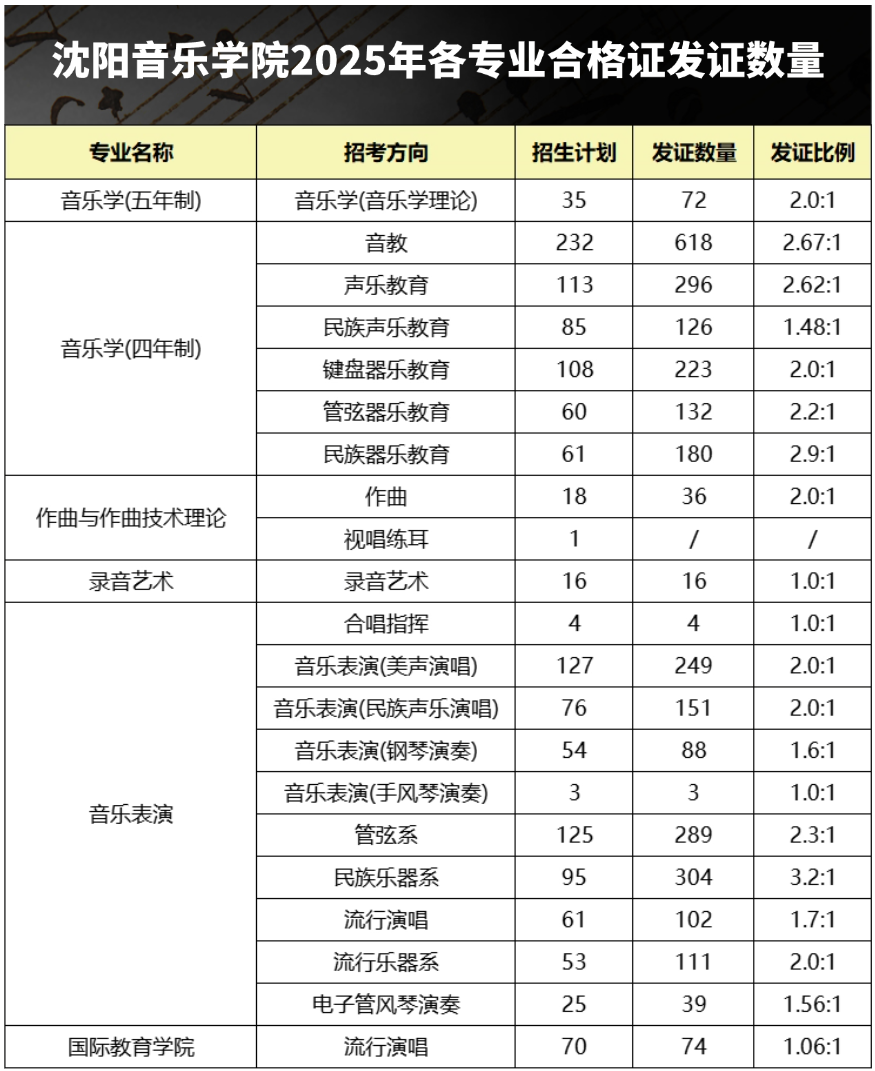 從發(fā)證比例來看,民族樂器系、民族器樂教育、聲樂教育及音樂教育等專業(yè)招生規(guī)模較大,合格證發(fā)放比例也相對較高。尤其是民族樂器系,發(fā)證數(shù)量達(dá)到錄取人數(shù)的3.2倍,競爭尤為激烈。建議專業(yè)排名稍靠后的考生,盡量將文化課成績提高至普通類本科線以上,以提升最終錄取機(jī)會。